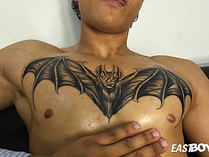 Here it is, the main video with Rafael Monteluz and his wild handjob session, where our new Mr. Handjob Junior dives in with full passion and intensity! This stunning muscular Latino stud with an angelic face, short curly hair, and a ripped athletic body gets fully worshipped for the very first time on camera. Across his powerful, sculpted pecs stretches a bold bat tattoo that makes his chest look even more irresistible. Mr. Handjob Junior dives in eagerly, his hands glide over Rafael's oiled-up muscles, squeezing those firm pecs, tracing the bat tattoo, rubbing tight abs and strong thighs until every inch shines. He teases sensitive nipples, then moves lower to those massive heavy balls. Rafael's thick, veiny cock stands rock-hard and throbbing as Junior wraps his fingers around it, stroking slow and firm, twisting around the swollen head while those full balls bounce with every pump. Rafael moans deeply, thrusts into the grip, clearly loving this new intense sensation. The handjob builds fast, muscles flexing, abs tightening, until he explodes with thick white ropes of cum shooting across his tattooed chest and ripped stomach, while Junior milks every last drop out of that veiny beast. Pure muscle worship, oil play, big veiny cock stroking, heavy balls teasing, and a massive explosive cumshot. Rafael Monteluz delivers raw pleasure in his debut scene. Only and exclusively on EastBoys.com!